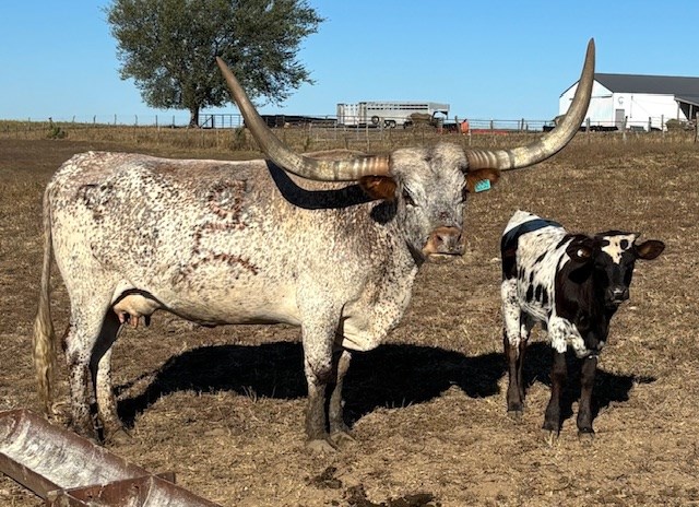 Dakota is a super producer and throws big bodied and colorful calves. Super easy keeper, excellent mama and loves scratches and treats. Exposed to our Black & White Bull "Love Warrior" for an early 2025 summer calf.